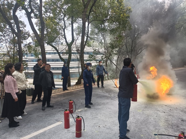 职工业务能力培训环节,在25栋学生宿舍旁的毕业林附近,全馆职工参加了主题为“人人讲安全,个个会应急”的消防安全综合演练。